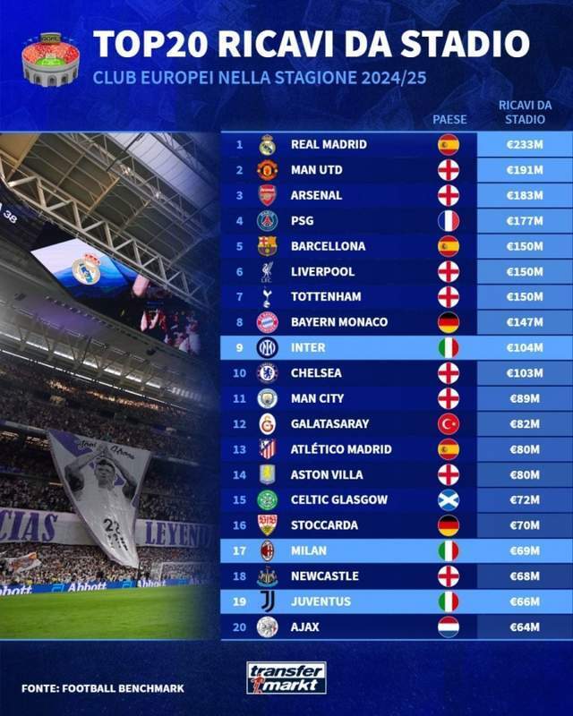 5 - 德转列上赛季欧洲俱乐部主场门票收入:皇马2.33亿居首,曼联1.91亿次席