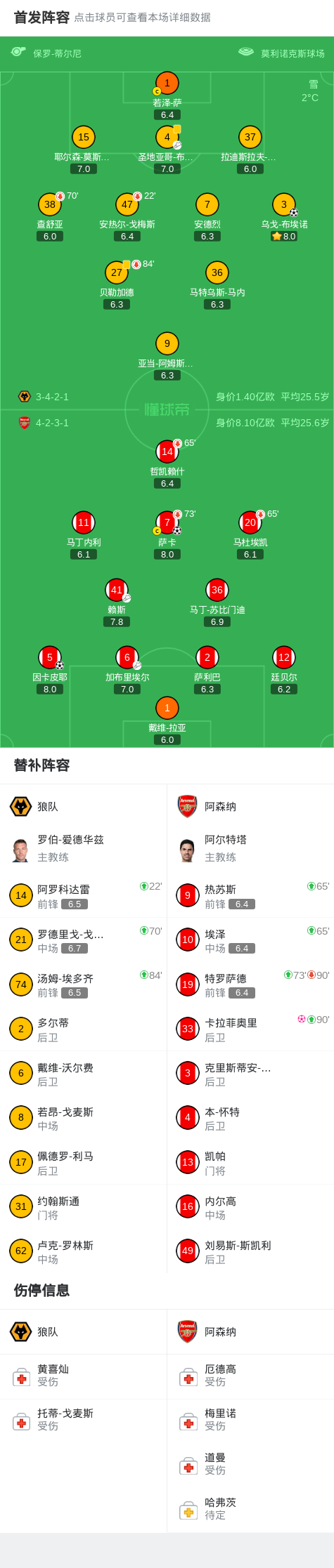 北京时间2月19日英格兰足球顶级联赛第31轮,狼队主场对阵阿森纳。狼队乌戈-布埃诺破门。阿森纳萨卡破门,因卡皮耶破门,卡拉菲奥里自摆乌龙。最终比分狼队 2-2 阿森纳。