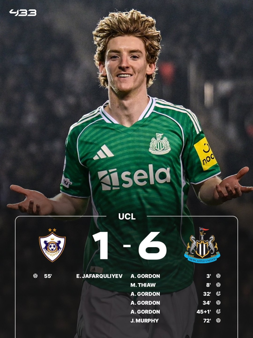 纽卡客场6-1击败卡拉巴赫,次回合将于北京时间2月25日在圣詹姆斯公园球场打响。戈登上演大四喜,特里皮尔助攻佳夫破门,卡拉巴赫扳回一城,雅各布-墨菲替补建功。
