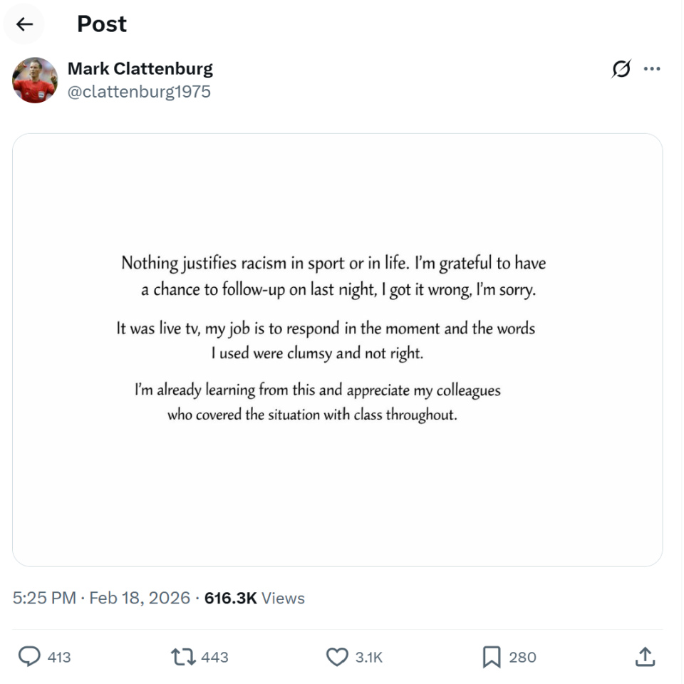 随后,现年50岁的克拉滕伯格随后在X上发文致歉:“无论是在体育领域还是在生活中,任何事情都不能成为种族主义的理由。我很感激能有机会对昨晚的言论作出说明。我说错了,对此我表示抱歉。当时是在电视直播中,我的工作是即时做出回应,但我使用的措辞笨拙且不恰当。我已经在从这件事中吸取教训,也感谢我的同事们在整个事件中的得体报道。”