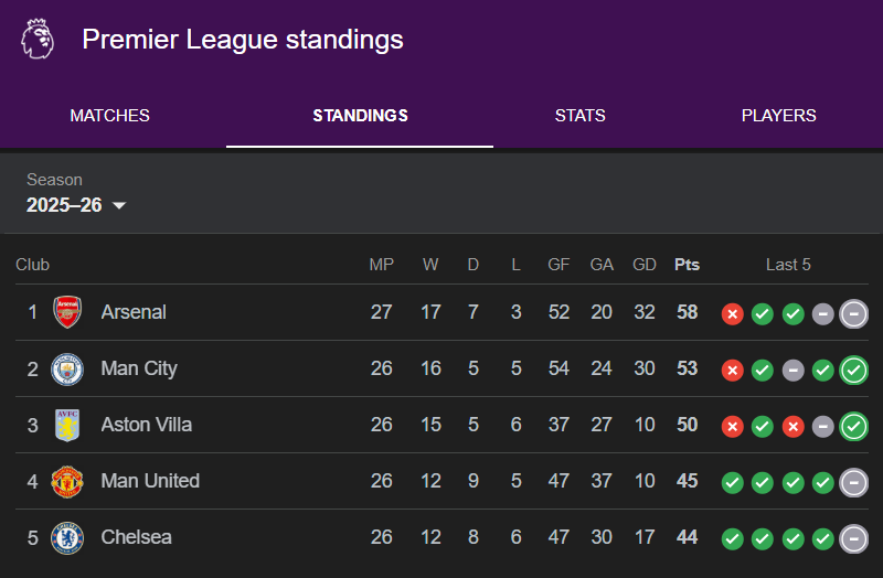 阿森纳现在只领先少赛一场的曼城5分;