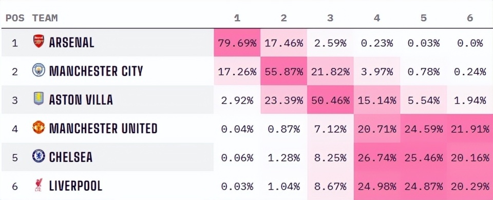 狼队2-2阿森纳后,数据机构Opta的超级计算机更新了英超夺冠概率,在最新预测结果中,阿森纳的夺冠概率已经从2月上旬的超90%跌至79.69%,下滑了整整十个百分点。但球迷认为数据机构Opta的超级计算机依然看低曼城,因为曼城在阿森纳2-2战平狼队之后的夺冠概率仅为17.26%,不足两成。