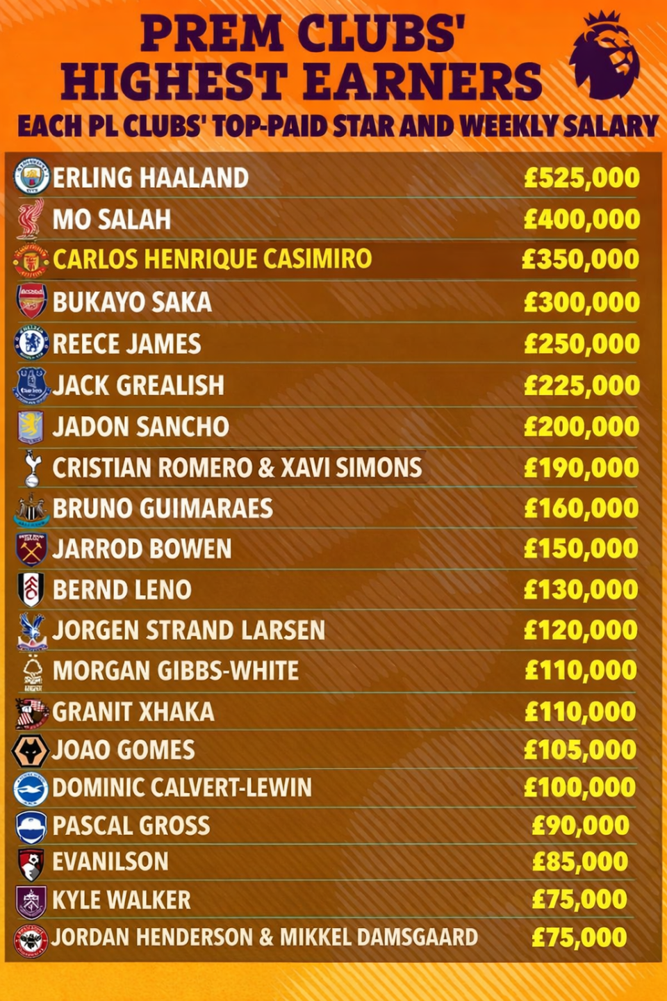 利物浦方面,穆罕默德·萨拉赫以40万英镑周薪领跑队内。