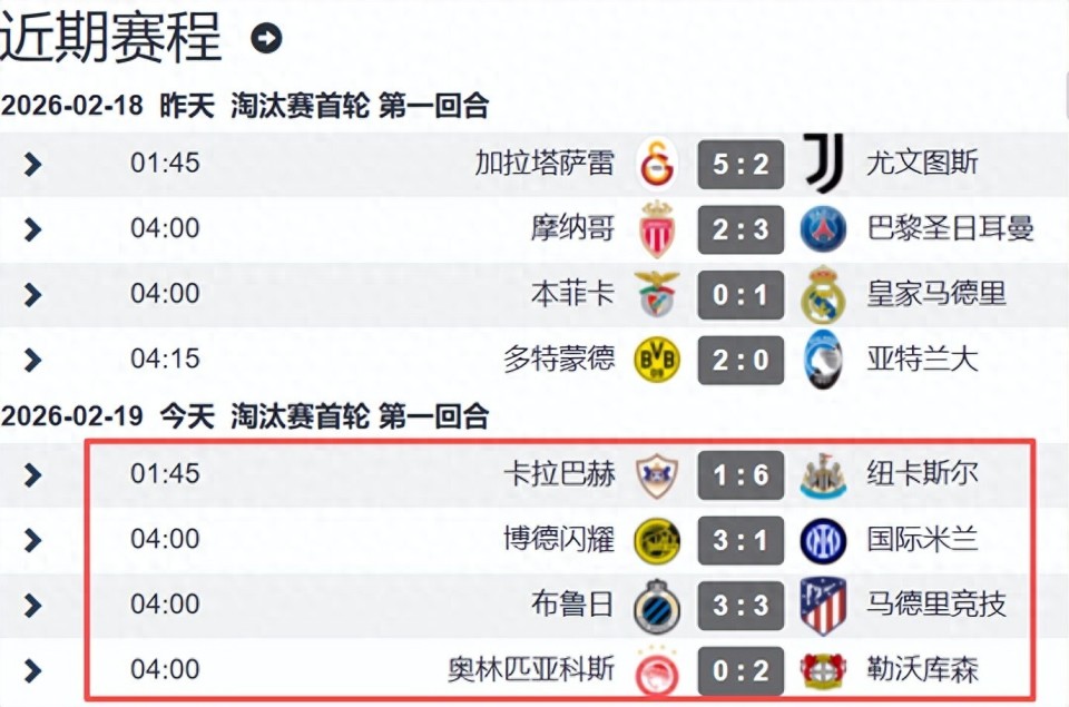 大年初三(2月11日)凌晨,欧冠淘汰赛附加赛首回合第二日4场比赛全部战罢,英超6队踢欧冠淘汰赛已经稳了,意甲球队真拉胯,德甲球队很整齐,一夜之间爆出两大冷门!