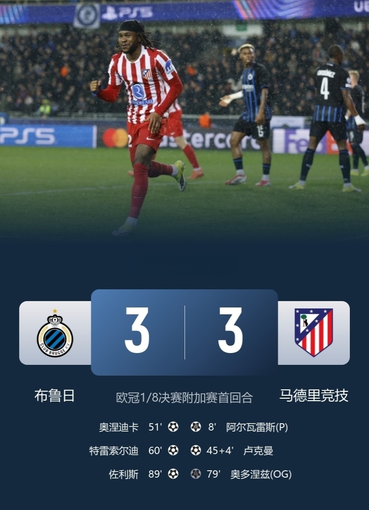 布鲁日3-3马竞!巴萨后遗症在延续,近4场仅1胜,就是半场4球赢巴萨!阿尔瓦雷斯点射,新援卢克曼破门!马竞抽到了非五大联赛球队,原本以为会是送分题,结果是附加题,对于床单军团而言难度很大。马竞客场战平布鲁日,也算是一个小冷门!