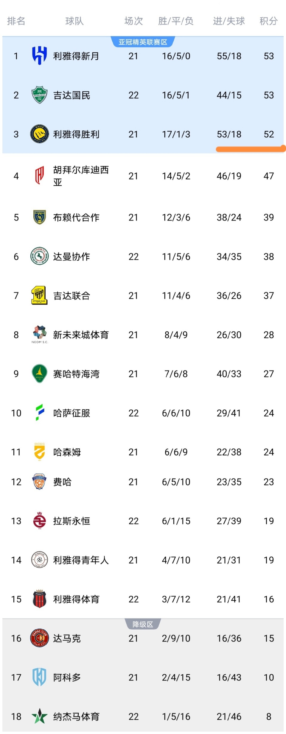 可以看到吉达国民大胜纳杰马体育队之后,积分上涨到了53分,已经反超了C罗的主队利雅得胜利队,升至了积分榜的第二位,积分追平了榜首的利雅得新月队,这也使得利雅得胜利队跌至第三位。而纳杰马体育输球之后,依然积8分垫底。利雅得体育队击败拉斯永恒之后,积分上涨到了16分,暂时逃离了降级区,而拉斯永恒输球之后,积分停留在19分,排名第13位,领先降级区4分。达曼协作击败哈萨征服之后,积分上涨到了38分,排名第6,而哈萨征服输球之后,积分停留在24分,排名第10。
