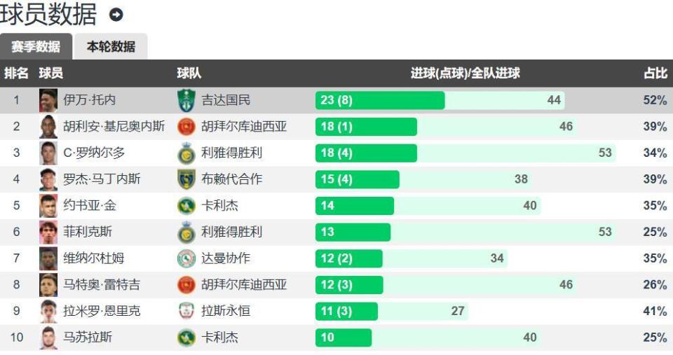 在沙特超最新一轮比赛中,吉达国民客场4-1大胜纳杰马体育,托尼上演了帽子戏法,这让托尼在沙特超射手榜上已经离开并列第二名的C罗5球,独自较大优势领跑沙特超射手榜。伊万的23个沙特超进球中含有8个点球,C罗18个沙特超进球中含有4个点球。
