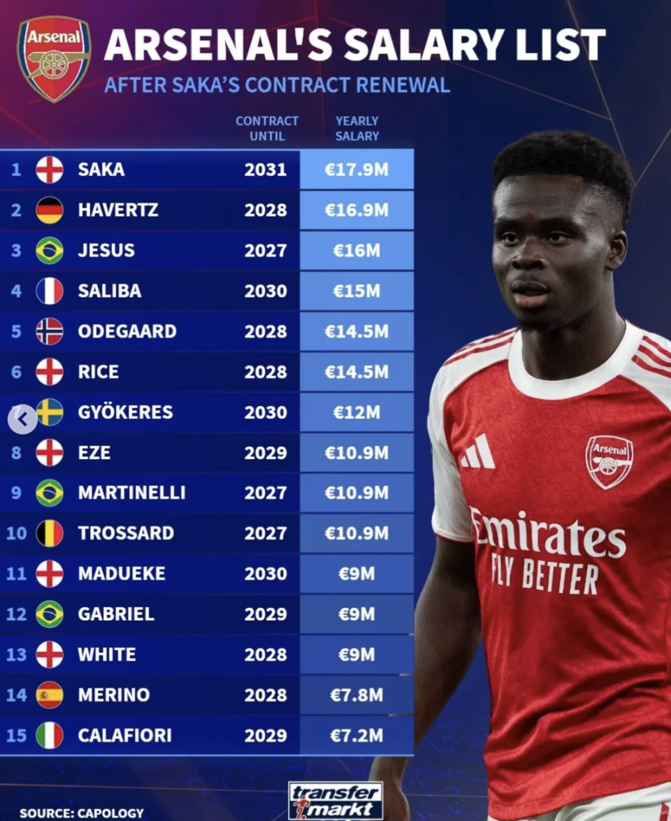 刚刚完成续约的萨卡以1790万的年薪居首;哈弗茨和热苏斯分别以1690万和1600万排名二三。