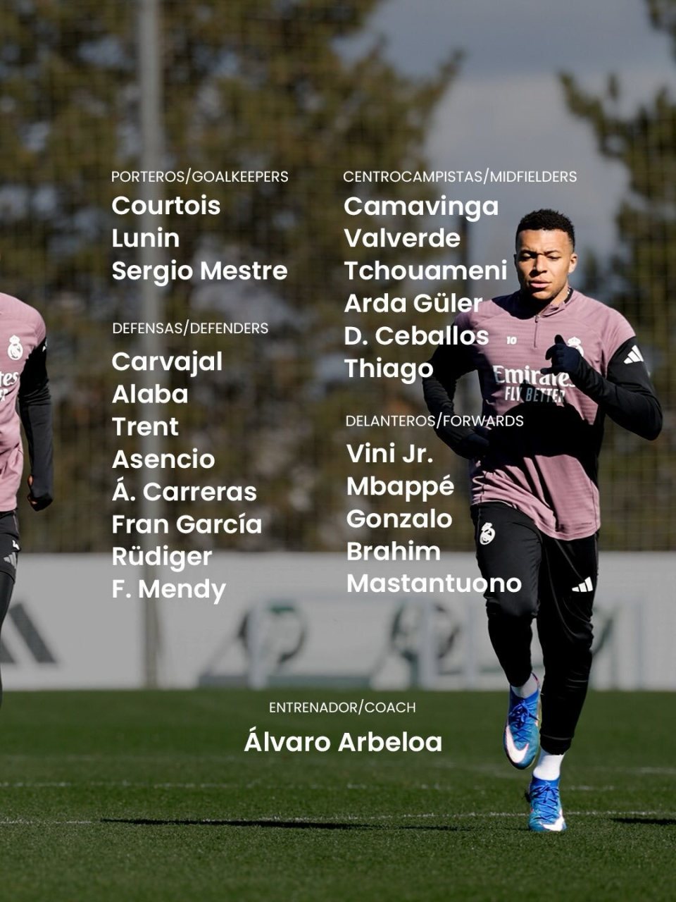 前锋:维尼修斯、姆巴佩、贡萨洛、卜拉欣-迪亚斯、马斯坦托诺