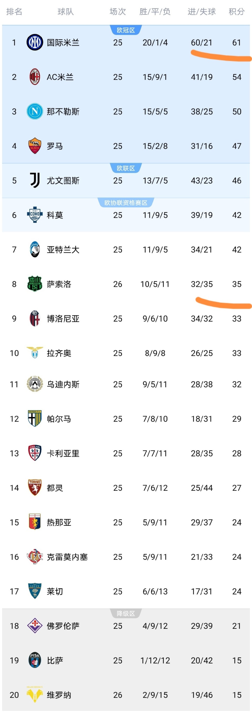 可以看到萨索洛队击败维罗纳之后,积分上涨到了35分,暂时领先第9的博洛尼亚队2分,排名第8,同时距离第7的亚特兰大队7分,此外距离第6的科莫队也是7分,萨索洛队有机会冲击欧战席位,当然这种难度还是很大的。而维罗纳输球之后,积分停留在15分,维罗纳队继续垫底,距离保级区9分,可见维罗纳队保级难度非常大,除非有奇迹,否则维罗纳基本预定了一个降级名额了。国米目前以7分优势领跑,优势还是很大的,AC米兰是国米最大竞争对手。罗马目前处于争四的有利位置,科莫也有争四的希望。
