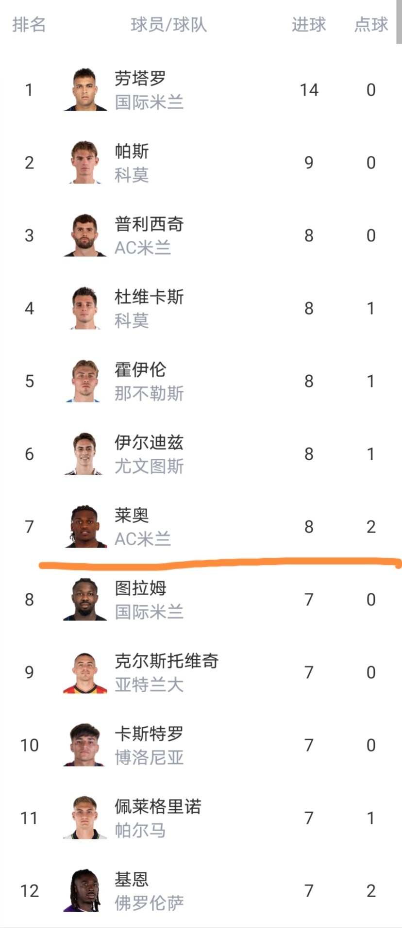 射手榜仅劳塔罗一人进球上双,射手榜前二被阿根廷人霸占。