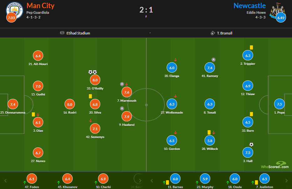 第90+2分钟,哈兰德和福登连续两脚打门,都被纽卡门将神勇挡出。
