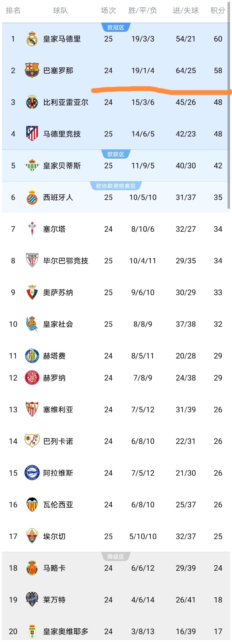 可以看到在皇马爆大冷门输球之后,积分榜停留在了60分,虽然依然领先第2的巴塞罗那队2分,但是皇马比巴塞罗那队多赛一场啊,所以皇马的榜首宝座不稳了,如果本轮巴塞罗那队主场击败莱万特,巴塞罗那就将从皇马手中再次抢过榜首宝座。皇马真是不争气啊,给你机会不中用啊。西甲争冠真是太刺激了。