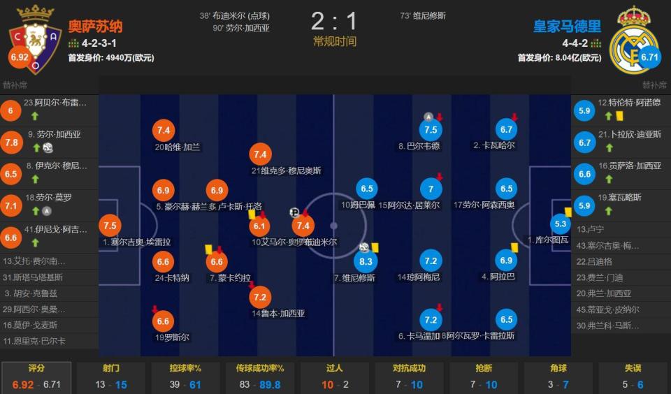 全场比赛,皇马的控球率为61%,一共有15次射门,其中5次射正;奥萨苏纳一共有13次射门,其中2次射正。
