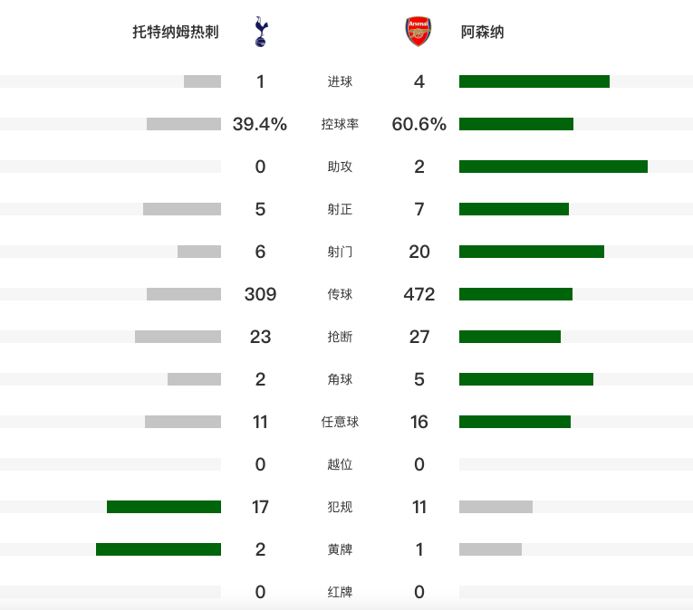 9轮不胜!英超:热刺1-4阿森纳连续两个赛季被双杀 埃泽约克雷斯各进两球