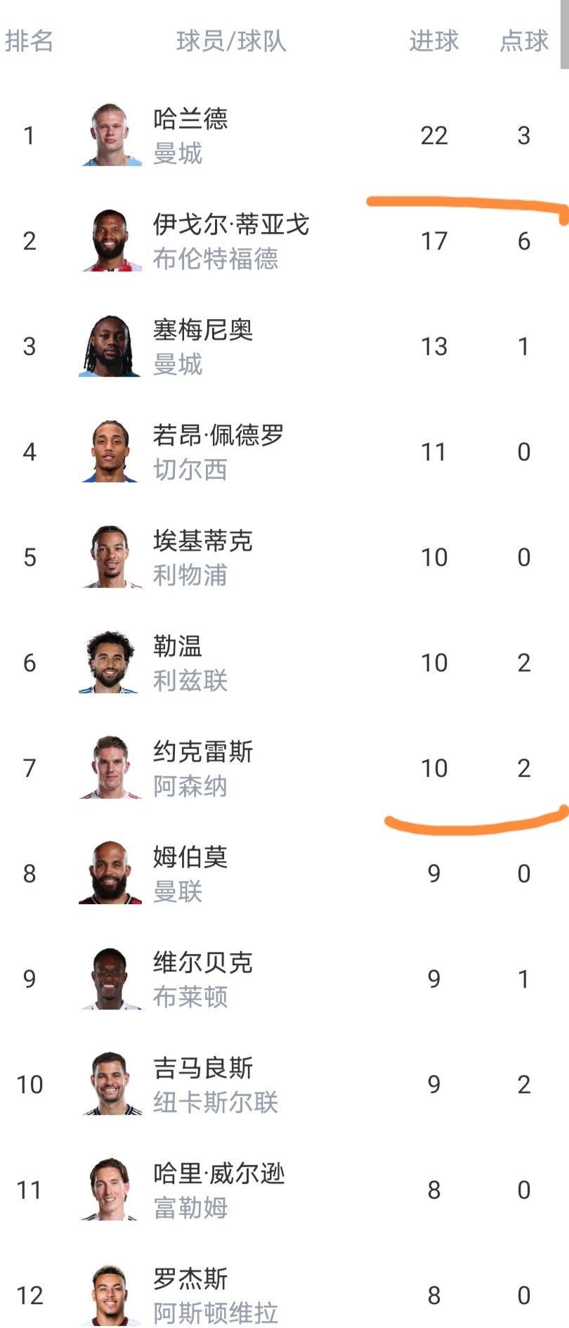 射手榜7人进球上双,哈兰德领先优势为5球。