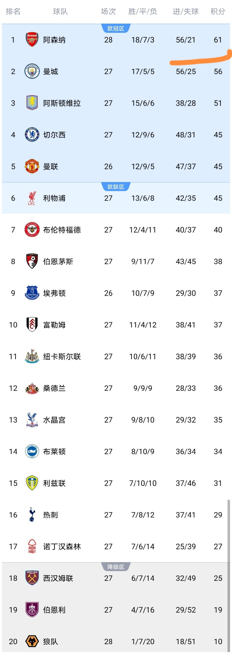 可以看到阿森纳大胜热刺之后,积分上涨到了61分,在多赛一场的情况下,暂时领先第2的曼城队5分,可以说阿森纳继续手握争冠主动权,而热刺输球之后,积分停留在了29分,排名第16,仅领先降级区4分,热刺有降级的风险啊。而利物浦在击败诺丁汉森林队之后,积分上涨到了45分,多赛一场的情况下,暂时追平了曼联。争五进入白热化阶段!