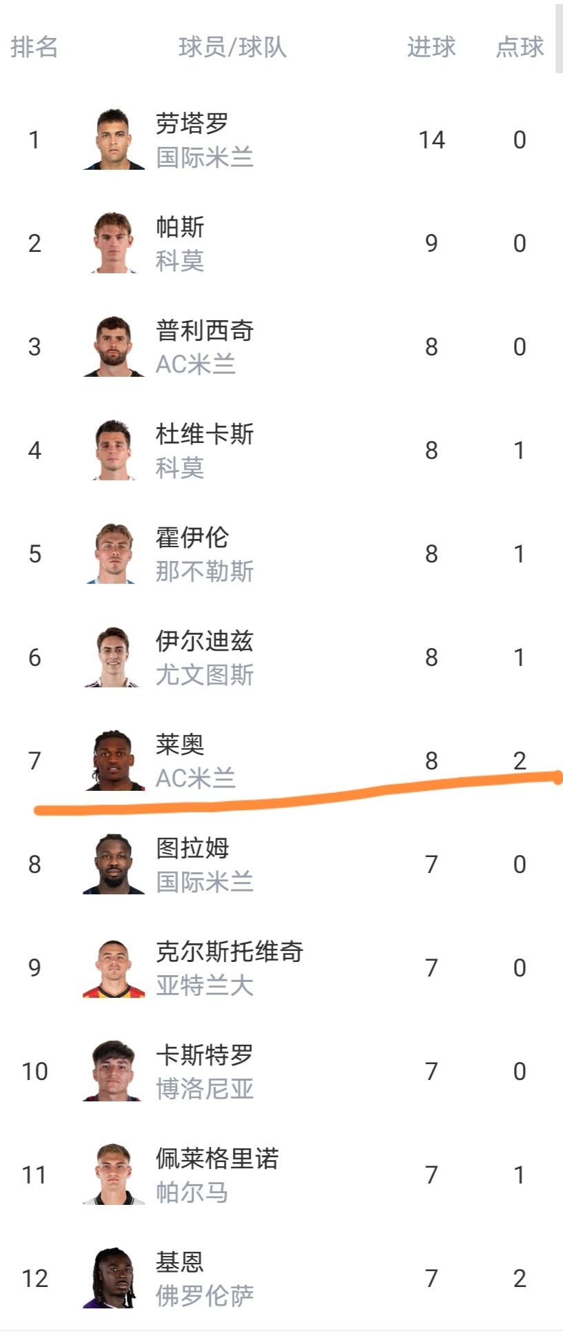 射手榜依然是7人进球7个以上,仅1人进球上双。