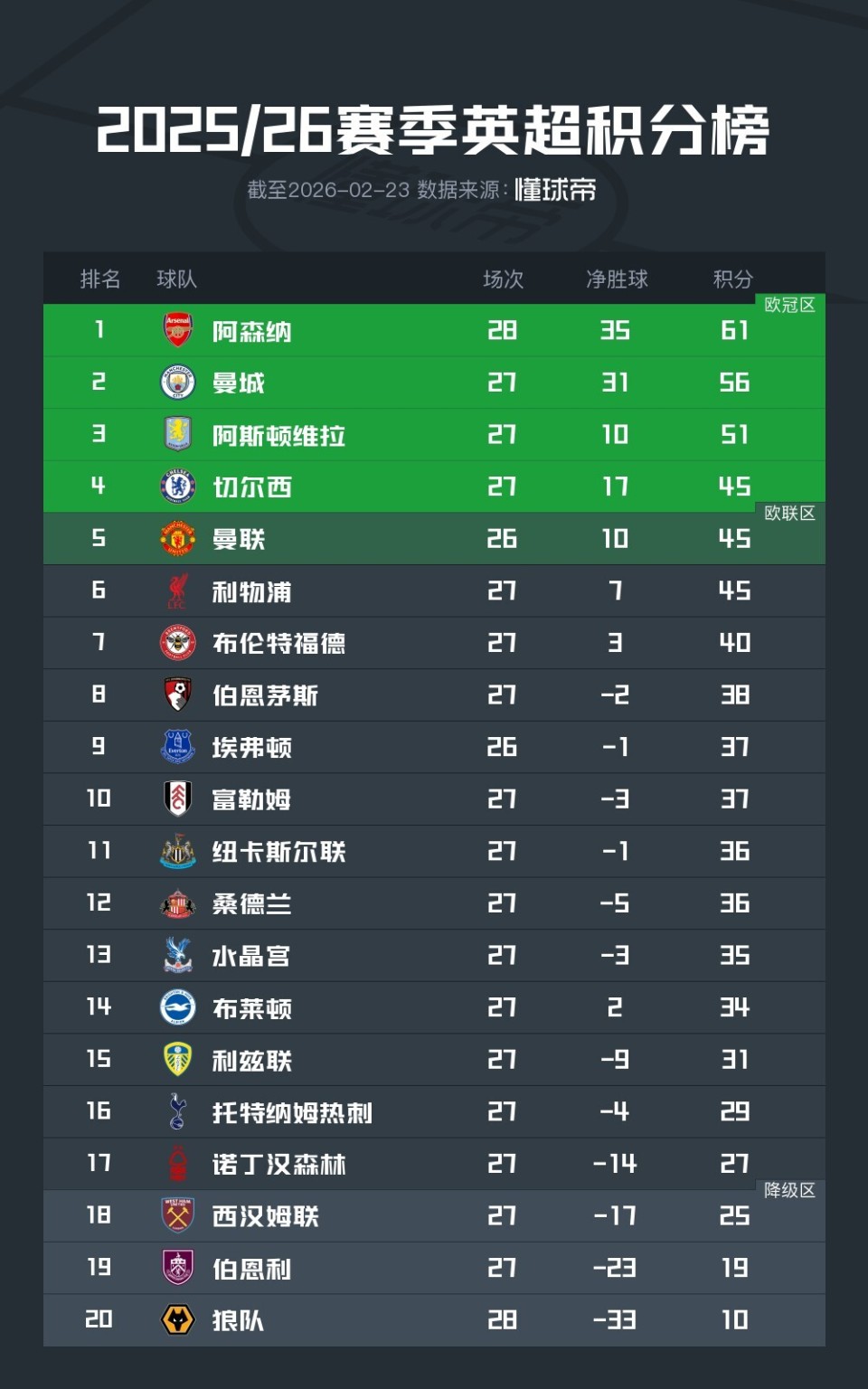阿森纳曼城未来英超赛程:第33轮天王山之战