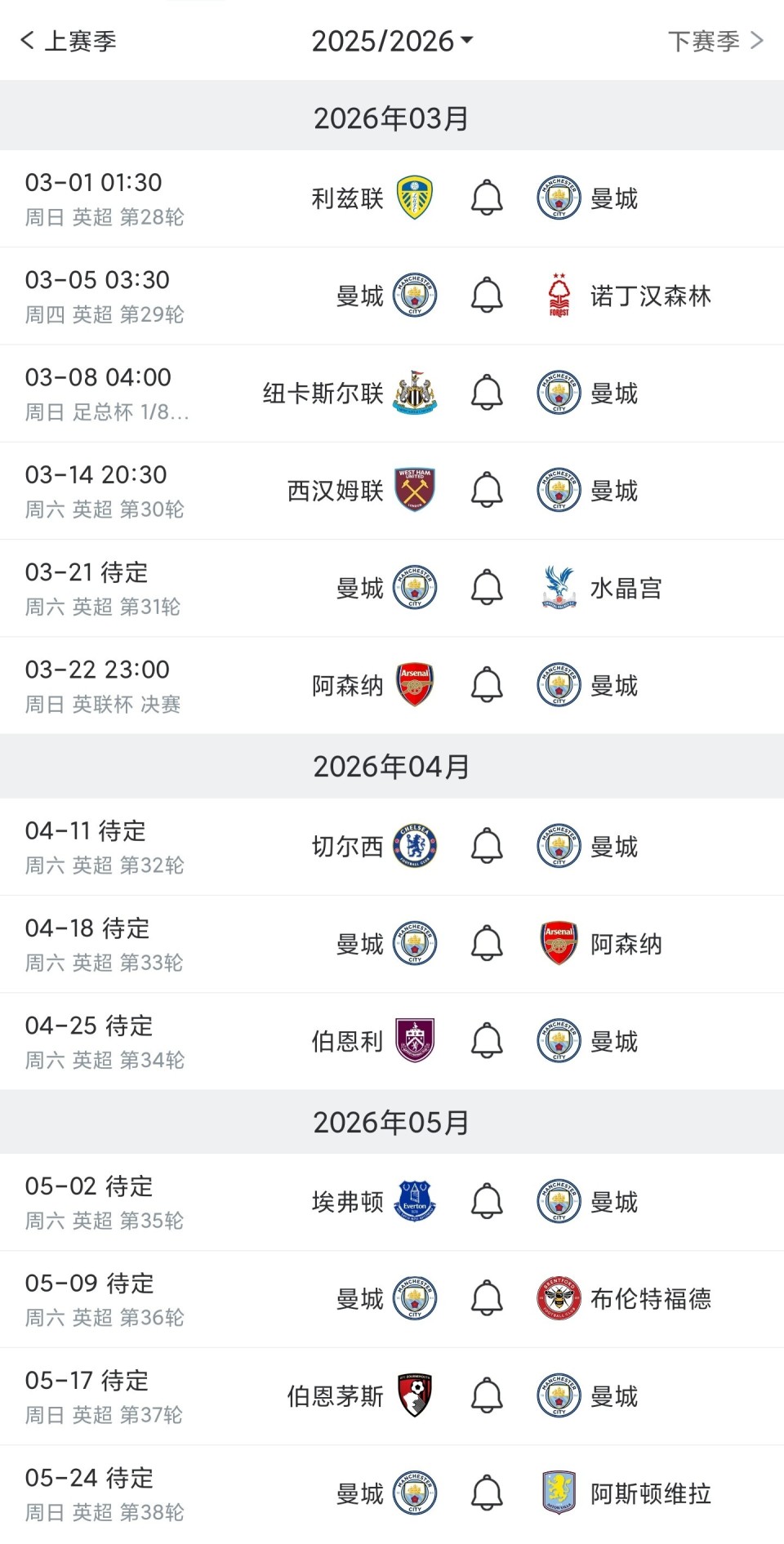 曼城剩余英超赛程