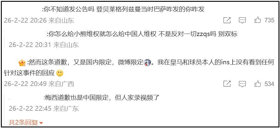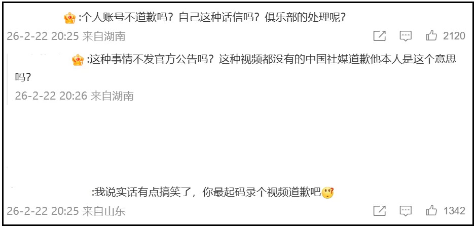 中国网友也不惯着了,纷纷表示不接受皇马俱乐部处理结果,所谓道歉动态下方评论区都沦陷了。