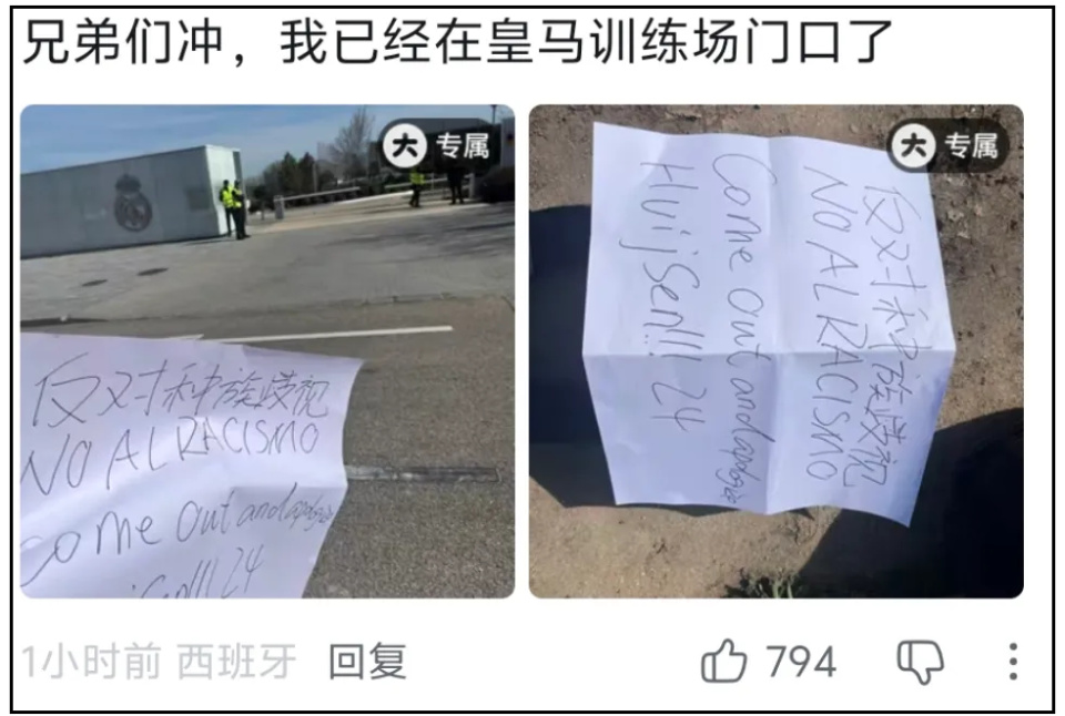 皇马俱乐部某站账号评论区,就有IP定位西班牙的网友留言,他晒出了自制反歧视标语,强调会前往皇马训练场表达态度,从网友晒出的照片看,他真的去了现场,为网友执行力点赞!
