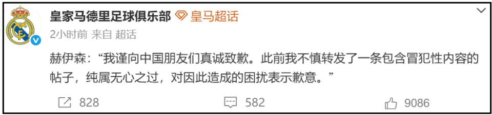 目前,皇家马德里足球俱乐部账号分别在微博和某站发布了道歉动态,内容如下: