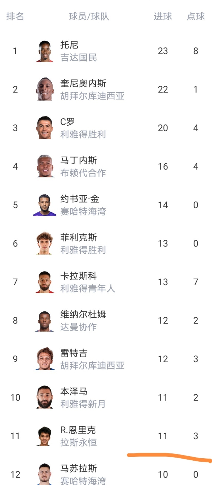射手榜11人进球超过了10个,C罗排名第3,落后榜首3球。
