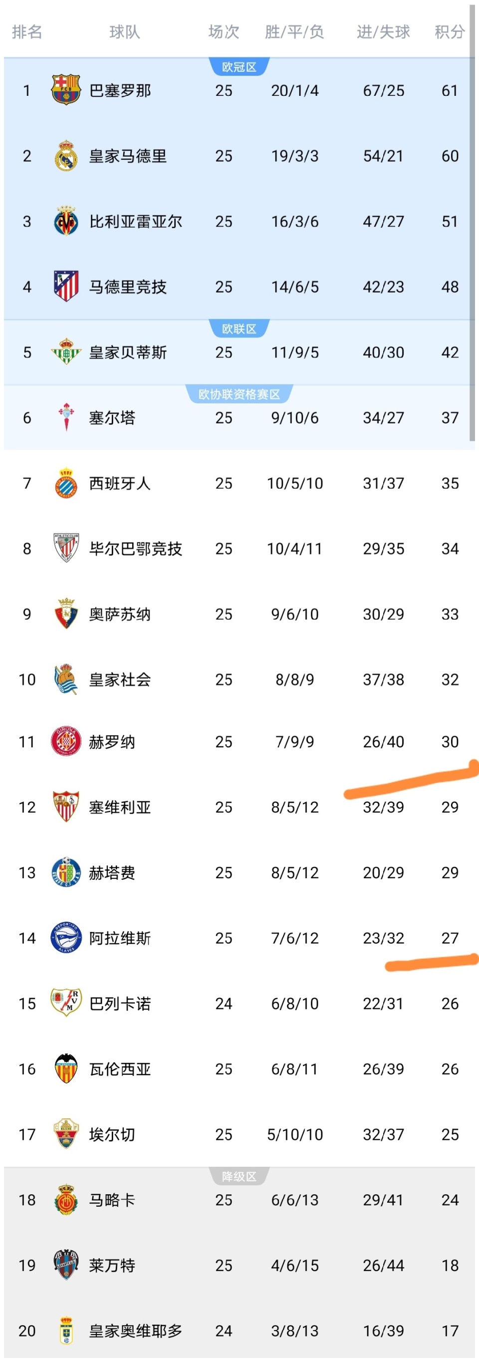 今天凌晨,西甲第25轮结束了最后一场较量,阿拉维斯、赫罗纳出战,这场比赛之后,西甲所有球队都已经踢完了第25轮的比赛,西甲积分榜也发生变化,我们来看看。