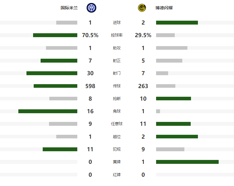 本场比赛国际米兰在主场攻势不减,却迟迟无法取得进球,博德闪耀则在下半场连入2球,虽然巴斯托尼随后打入挽回颜面的一球,却无力改变输球的结局,最终客场2-1完胜国米,两回合大比分5-2昂首晋级欧冠十六强。
