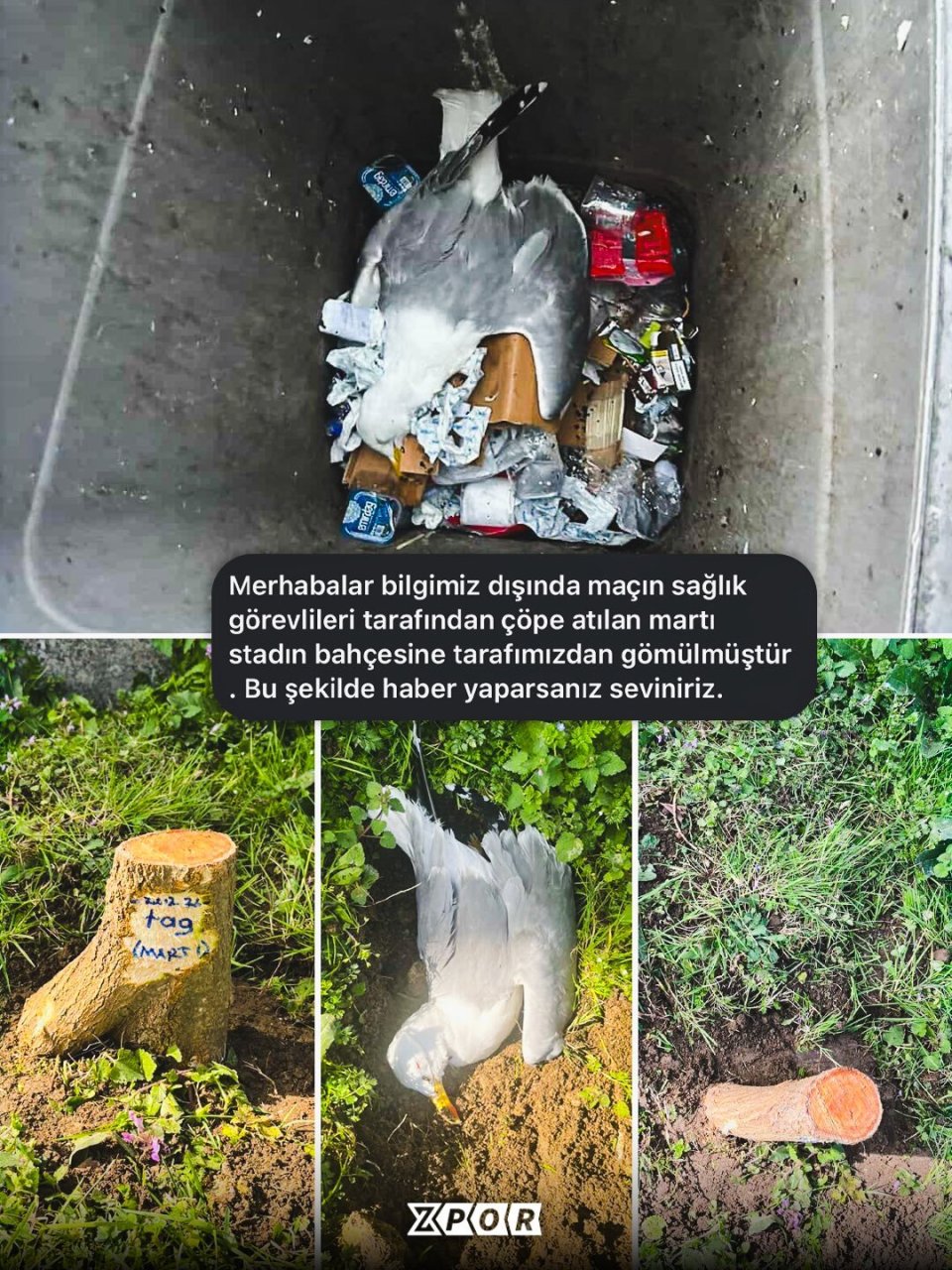然而,根据土耳其媒体Zpor发布的最新照片,这只海鸥最终死亡,尸体被扔进了体育场的垃圾桶。之后有人将这只海鸥从垃圾桶里捡了出来,并将其埋葬。