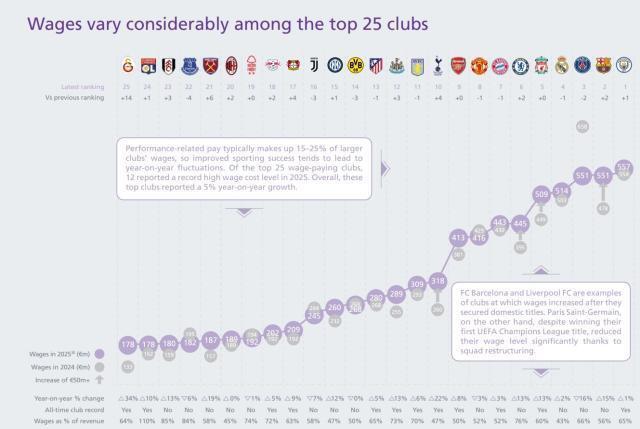 02月26日讯 欧足联公布新一期俱乐部财务状况报告,其中涉及了欧洲俱乐部在2025年的薪资支出排名。