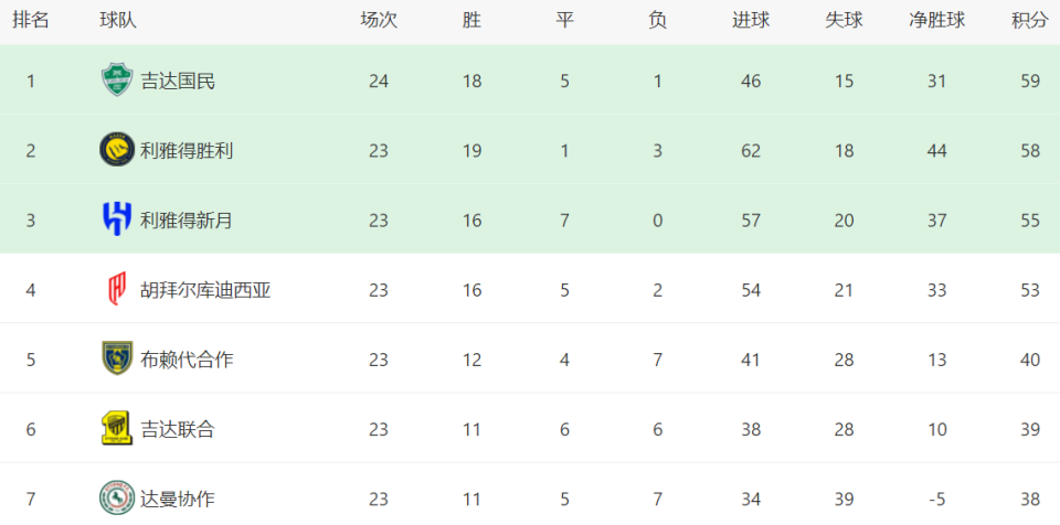 这场比赛让沙特联赛榜首易主。先赛一场的吉达国民登顶榜首位置。吉达国民总积分达到59分。C罗所在的球队利雅得胜利被挤下去了,掉到了第2名。利雅得胜利的总积分是58分。另一支夺冠大热门球队利雅得新月只有55分,排名第3。前3的球队差距最多4分,冠军的争夺非常激烈。