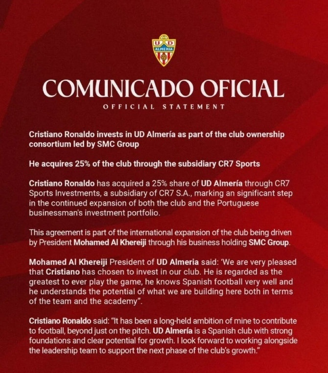 C罗发布声明称:“长期以来,我一直有志于在球场之外为足球做出贡献。阿尔梅里亚是一家拥有坚实基础和明显成长潜力的西班牙俱乐部。我希望能与管理团队合作,支持俱乐部进入新的成长阶段。”