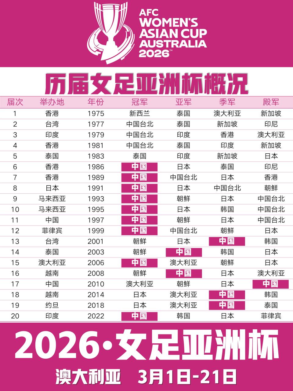 北京时间3月1日,2026年女足亚洲杯将在澳大利亚正式拉开战幕。本届赛事将持续至3月21日,共有12支球队参赛。对于中国女足而言,这不仅是一次卫冕之战,更是一次通往2027年巴西女足世界杯的关键战役——亚洲区6个直通名额。