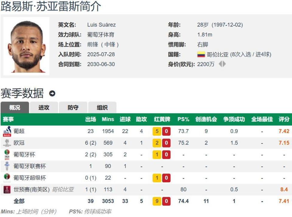 苏亚雷斯现年28岁,哥伦比亚国脚,右脚中锋,身高1.81米,德转估价2200万欧元,合同至2030年。苏亚雷斯本赛季非常高效,至今各项赛事共为葡萄牙体育出场37次,其中32次首发,打入了惊人的29个进球,还有6次助攻,其中葡超23场22球4助,欧冠8场4球1助。