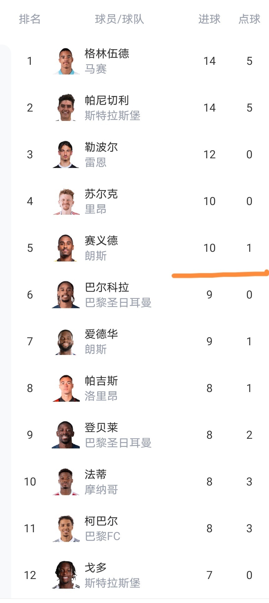 射手榜5人进球上双,两人并列第一,金靴争夺白热化。