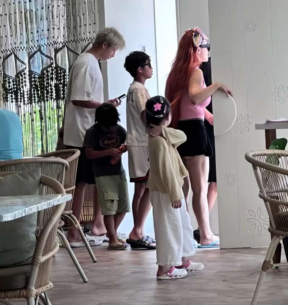 网友还拍到了一家人离开时候的画面,冉莹颖也换了新造型,挑染了一头红色头发,远远的看着像个精神小妹。