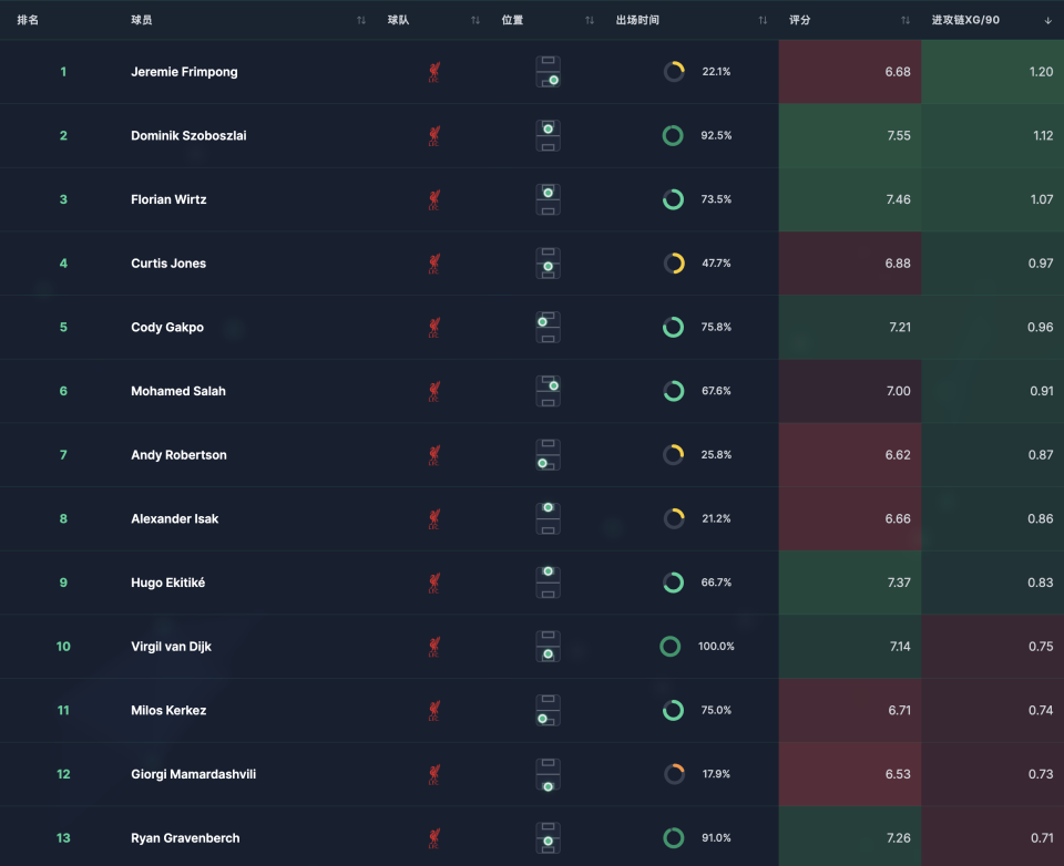 我们看xGChain里,弗林蓬虽然出场时间少,但是单论单场的贡献,比右路那个铁首发要高得多,右路那个铁首发,都快打成二前锋了,吃最多的资源,其进攻上创造机会的贡献甚至可以和后卫坐一桌。