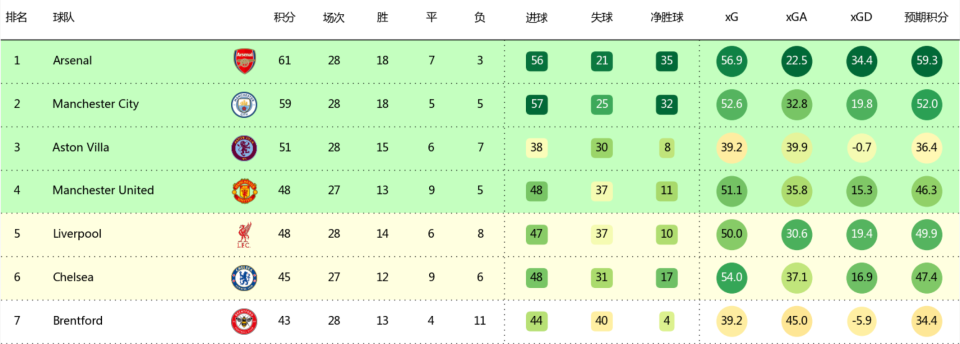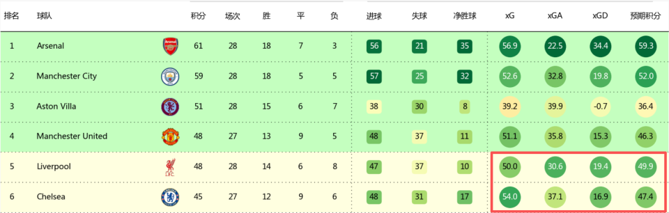 切尔西其实各项客观指标都和利物浦相似,预期进球挺多的,大部分没把握住,不同的在于,切尔西能在一堆红牌当中走出来,一个是门将桑切斯的进化成功,大幅降低了预期失球和实际失球比,二来是在定位球当中做得不错,目前利物浦也有追赶之势。