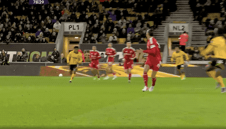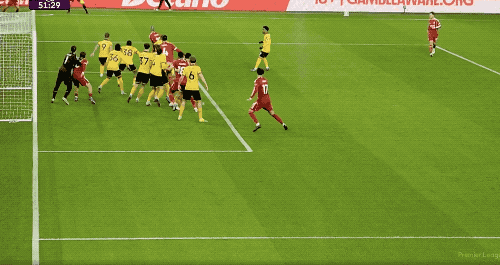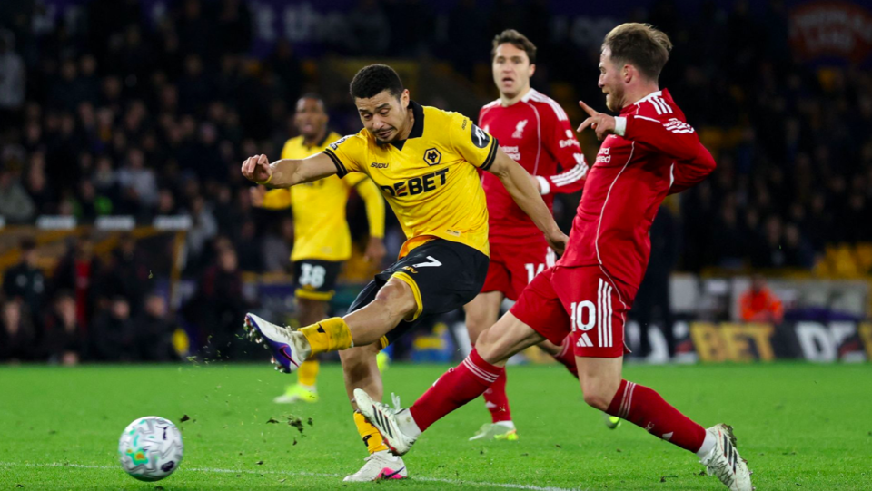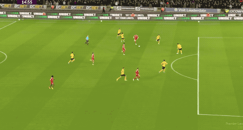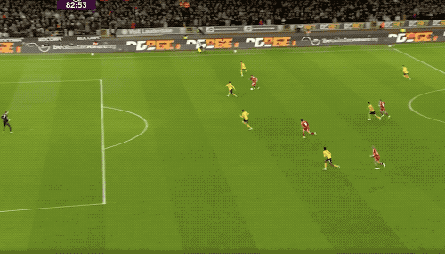 第94分钟,阿利松开球被拦截,特林达德的射门打在戈麦斯的腿上产生折射,狼队打进绝杀。