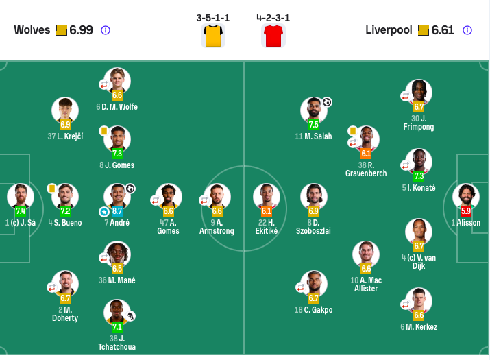 狼队首发:1-若泽·萨、2-多赫蒂(60’14-阿洛科达尔)、4-圣地亚哥·布埃诺、6-沃尔费(79’3-乌戈·布埃诺)、38-查丘瓦、37-克雷伊奇、47-安赫尔·戈麦斯(60’15-耶森·莫斯克拉)、7-特林达德、8-若昂·戈麦斯、36-马特乌斯·马内(70’21-罗德里戈·戈麦斯)、9-阿姆斯特朗(60’27-贝莱加德)。