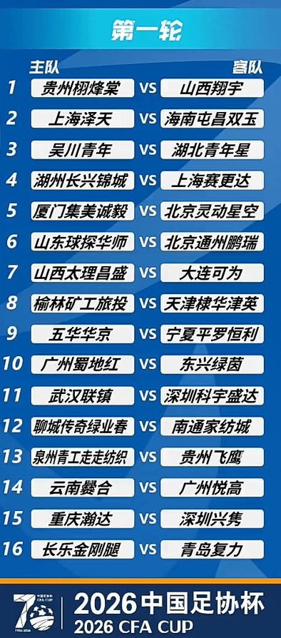 虎扑03月04日讯 2026年足协杯1-4轮抽签结果出炉,恰逢足协杯70周年,今年一共80支球队参赛。中甲球队第三轮登场,中超球队第四轮登场。