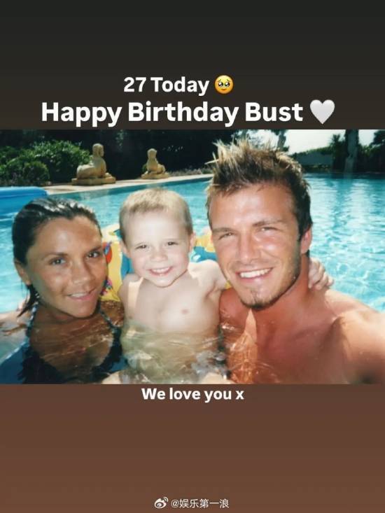 贝克汉姆夫妇于布鲁克林27岁生日当天(2026年3月4日)在Instagram分别发布其幼年照片并配文祝福。大卫晒出三人泳池合影称"生日快乐Bust(昵称),我们爱你",维多利亚上传母子互动旧照写道"生日快乐布鲁克林,我们非常爱你"。