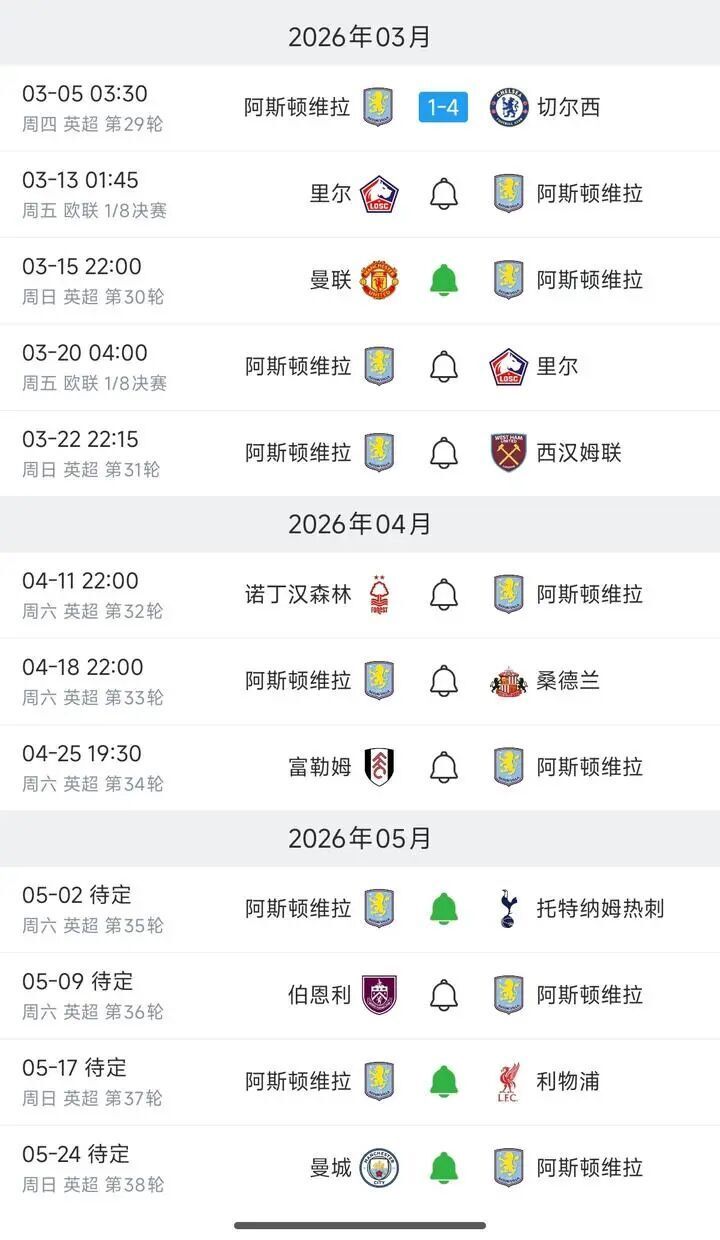 曼联之后的三家里,维拉的近况是最差的——2月份到现在,他们好像一共就赢过1场球,目前是4论不胜。25轮的时候,还明明领先第6名就是8分(47对39)。结果现在就就差3分了。