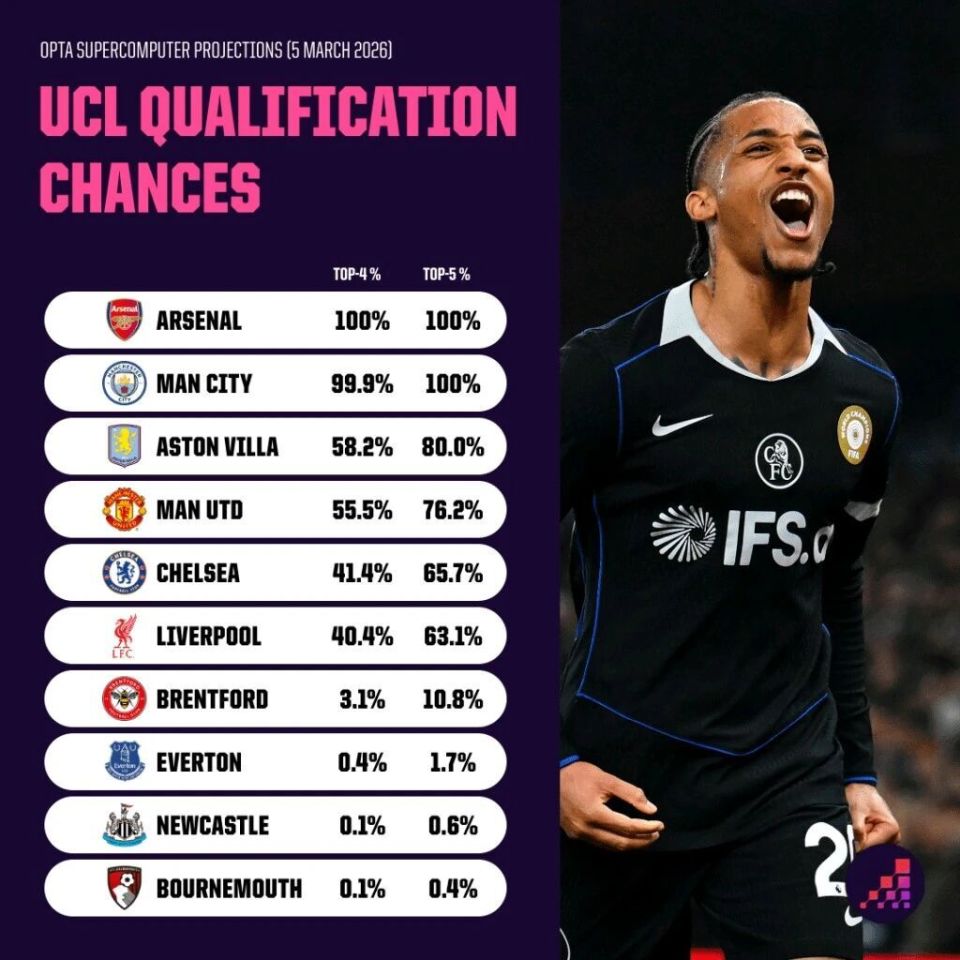 首先明摆着,英超前两名的位置相当稳固。所以,现在就是曼联、维拉、利物浦和切尔西四家争三的情况。不过你看连opta这种机构,在“10000次计算机模拟”之后给出的概率,也模糊至极,感觉给了还不如不给。