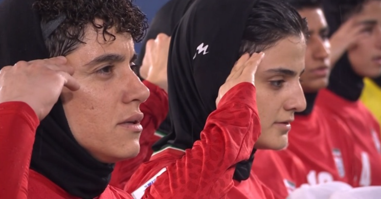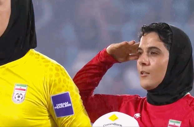 而赛前的奏国歌仪式,伊朗女足首发11人再次集体敬军礼,并且高唱国歌。主帅贾法里和伊朗女足替补席球员和工作人员,也做出了同样的动作。