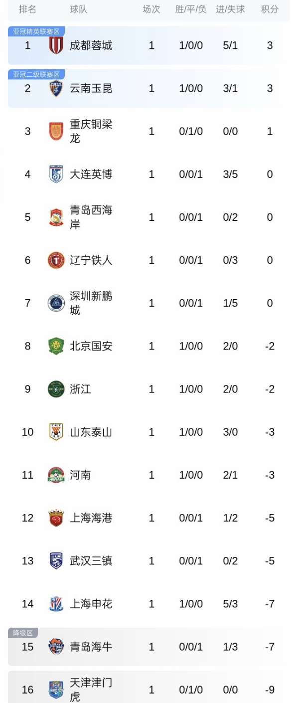 随着国安2-0完胜三镇,中超首轮收官!最新积分榜:泰山跌至第10