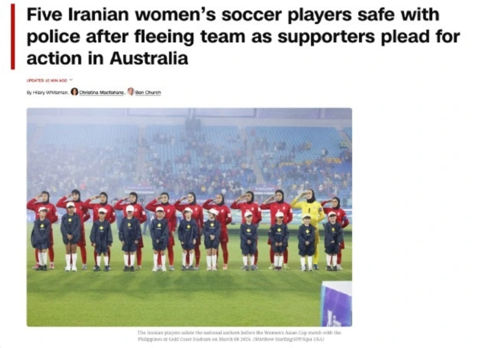北京时间3月9日,来自CNN、The Athletic等英美外媒的报道,由于受到首轮未唱国歌事件的影响,伊朗女足已有5名球员逃离球队在澳大利亚下榻的酒店,寻求当地警方庇护。