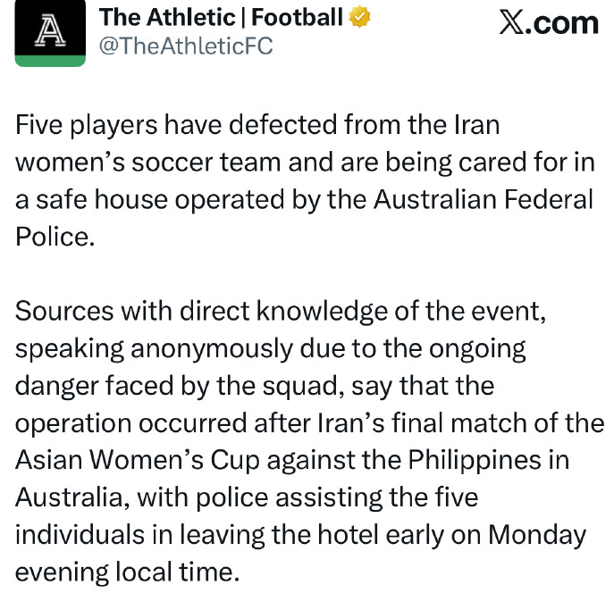 消息人士透露,此次行动发生在伊朗女足对阵菲律宾女足的比赛之后,考虑到回国可能会被逮捕并且遭受处罚,出于对自身安全的担忧,5名伊朗女足队员已逃离球队,离开了她们在澳大利亚下榻的酒店。
